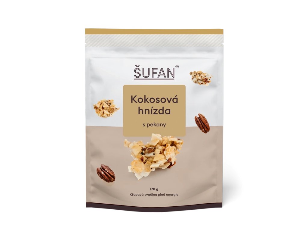 Kokos chips 51‚7 %, rýžový sirup, třtinový cukr, pekanové ořechy 14 %, slunečnicová semínka, lněná semínka, chia semínka (salvia hispanica), sůl.
