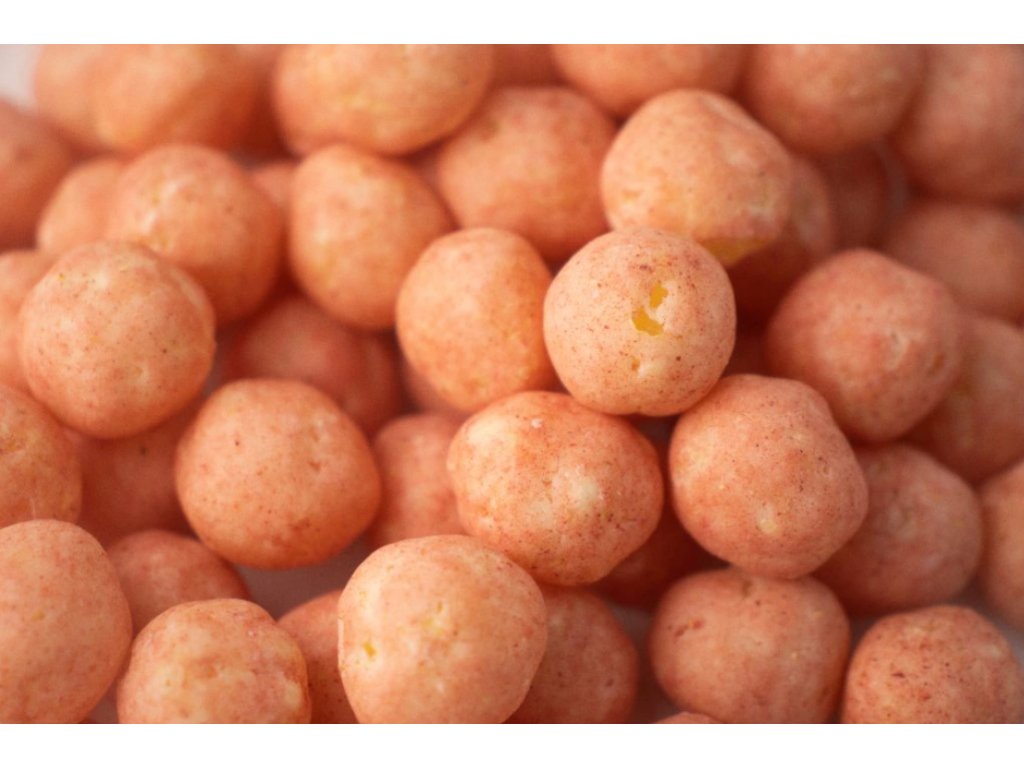 Nadýchaná kukuřičná kulička nejdřív hezky křupne a vzápětí vás zaplaví chuť jemného jogurtu a jahody. Každá křupka je totiž obalená v prášku z lyofilizovaných jahod.