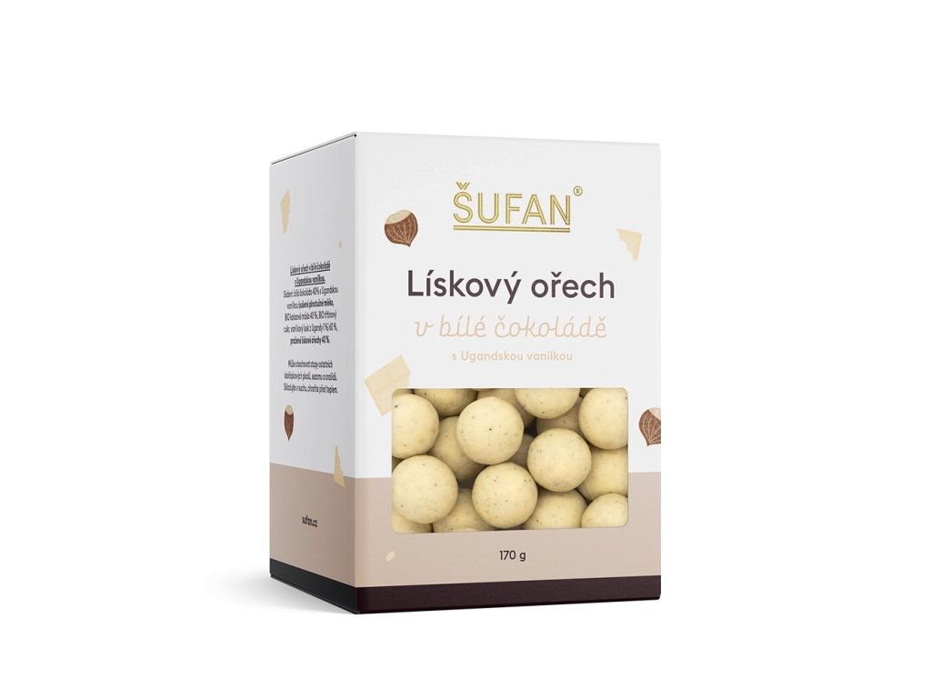 Bílá čokoláda 40% s Ugandskou vanilkou (sušené plnotučné mléko, kakaové máslo 40 %, třtinový cukr, vanilkový lusk z Ugandy 1 %) 60 %, pražené lískové ořechy40 %.