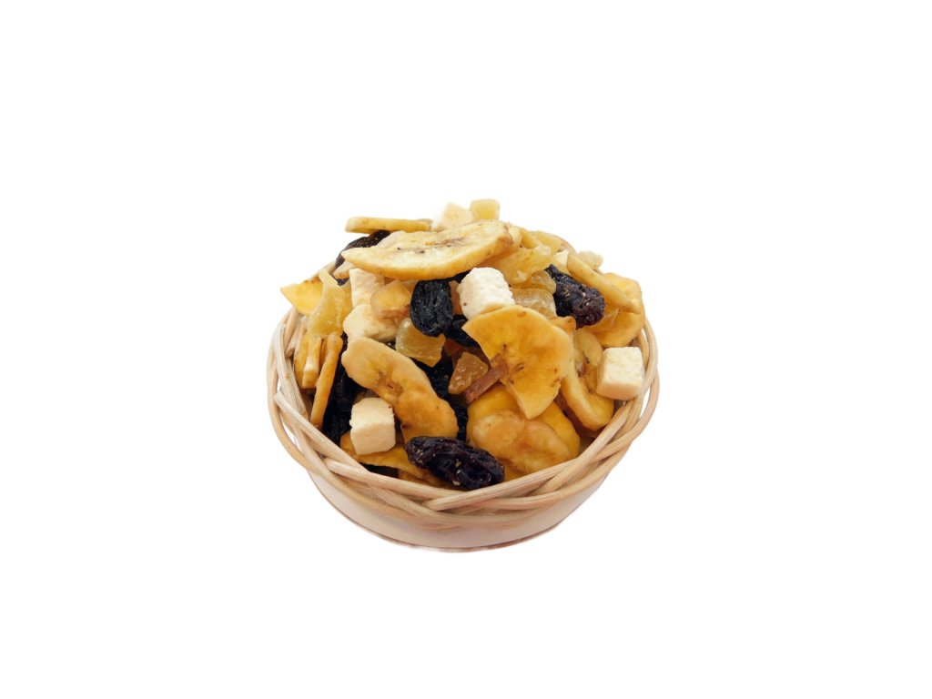 Složení: ananas kostky (ananas 51 %, cukr 48 %, konzervant E330 oxid siřičitý), banán chips (89 % zelený banán, 8 % kokosový olej, 2,99 % třtinový cukr, 0,01 % přírodní banánové aroma), papaya kostky (papaya 62 %, cukr, konzervant E330 oxid siřičitý), rozinky (rozinky 99,7 %, 0,3 % slunečnicový olej), kokos chips natural (kokos chips 100 %).