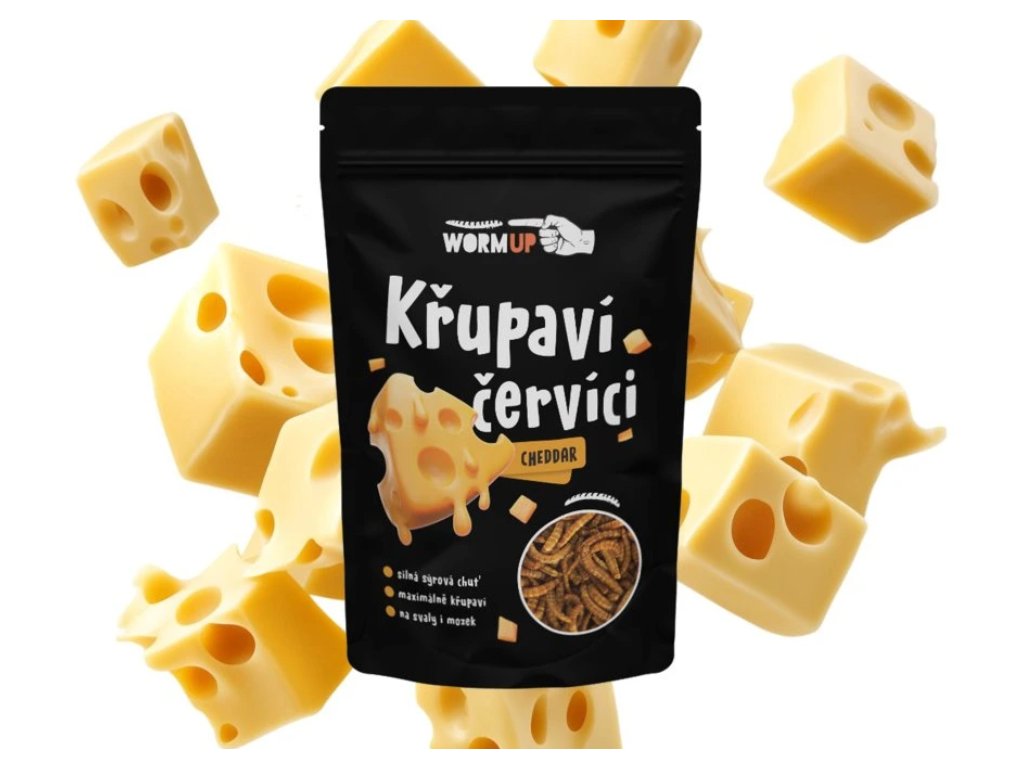 Sušené larvy potemníka moučného (Tenebrio molitor), maltodextrin, sůl, přírodní aroma, mléko, cukr, čedarové aroma, syrovátka.
